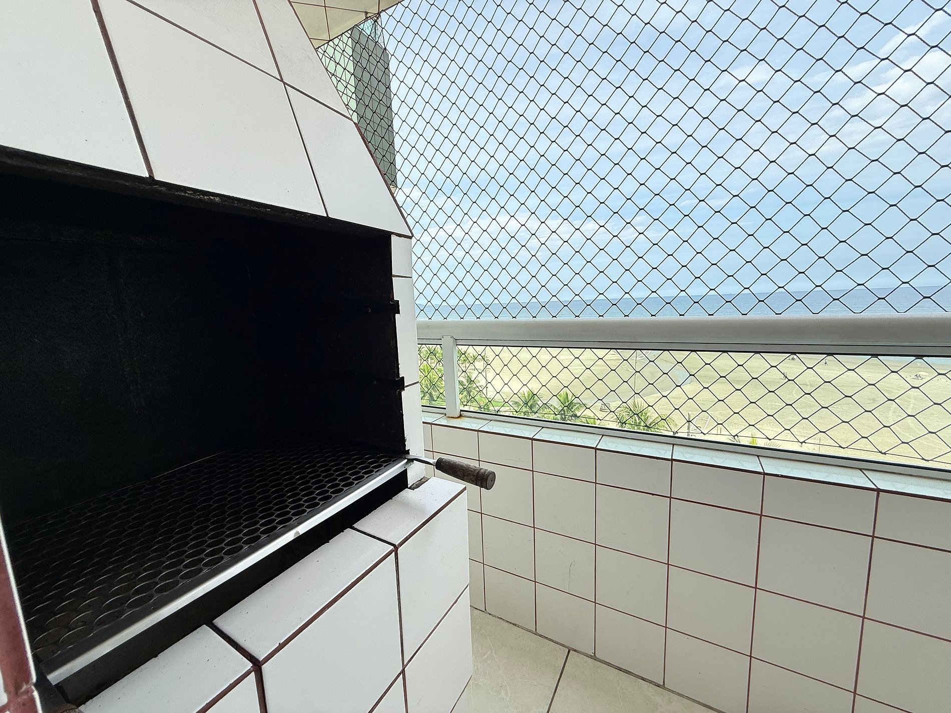 Churrasqueira na varanda com vista para o mar.